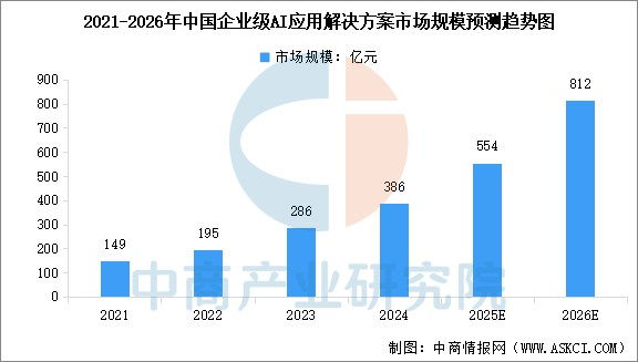 企业级人工智能应用解决方案指将人工智能算法融入硬件、软件及服务以向企业提供的各种解决方案。中商产业研究院发布的《2025-2030年人工智能技术应用行业市场调研及投资前景预测报告》显示,中国企业级AI应用解决方案市场规模已从2021年的149亿元增长至2024年的386亿元。中商产业研究院分析师预测,在各行各业广泛采用企业级人工智能应用解决方案及人工智能技术不断创新的推动下,2025年中国企业级AI应用解决方案市场规模将达到554亿元,2026年市场规模将达到812亿元。