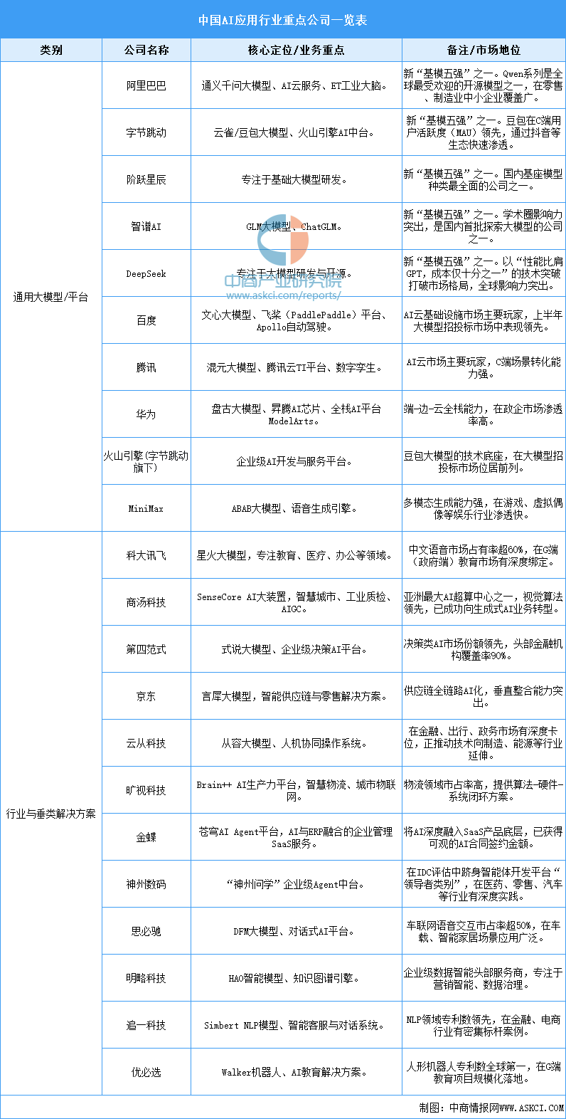 中国AI应用行业已形成清晰格局:以阿里巴巴、字节跳动、阶跃星辰、智谱AI和DeepSeek为代表的新“基模五强”引领通用大模型发展;百度、腾讯、华为等巨头提供全栈AI平台。在行业解决方案层面,商汤科技(智慧城市与视觉)、第四范式(企业决策AI)、科大讯飞(教育医疗语音)、云从科技(人机协同)等深耕垂直领域。