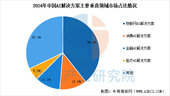 中商产业研究院发布的《2025-2030年人工智能技术应用行业市场调研及投资前景预测报告》显示,2024年中国AI解决方案市场中,占比最大的是物联网AI解决方案,达到39.4%。其次是消费AI解决方案和金融AI解决方案,分别占比12.0%和11.1%。