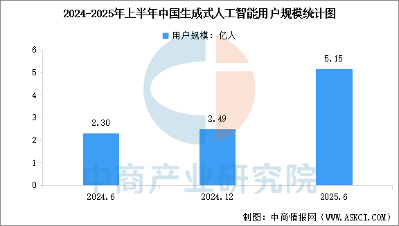 我国生成式人工智能用户规模快速增长。中商产业研究院发布的《人工智能系列专题之中国生成式AI产业全景与机会洞察专题研究报告》显示,截至2024年12月,我国生成式人工智能产品的用户规模达2.49亿人,占整体人口的17.7%。截至2025年6月,中国生成式人工智能用户规模达5.15亿人,较2024年12月增长2.66亿人,生成式人工智能普及率达36.5%,较2024年12月提升18.8个百分点。