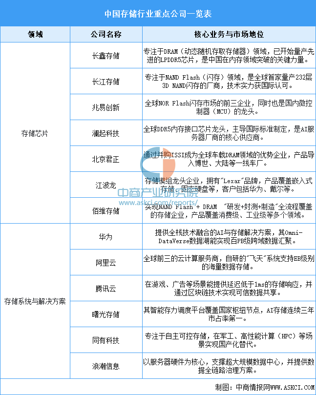 中国的存储行业公司主要分为两大阵营,分别是专注于底层存储芯片研发设计的企业,以及面向应用的大数据存储系统与解决方案提供商。下面表格汇总了这两个方向的重点公司及其核心业务: