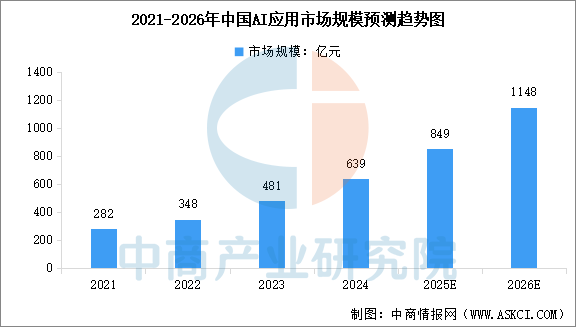 随着技术的不断成熟和应用场景的不断拓展,AI加速渗透,为企业和个人用户提供高效、智能的解决方案。中商产业研究院发布的《2025-2030年人工智能技术应用行业市场调研及投资前景预测报告》显示,中国AI应用市场规模由2021年的282亿元增至2024年的639亿元,2021年至2024年的复合年增长率为31.35%。中商产业研究院分析师预测,2025年中国AI应用市场规模将达到849亿元,2026年市场规模将达到1148亿元。