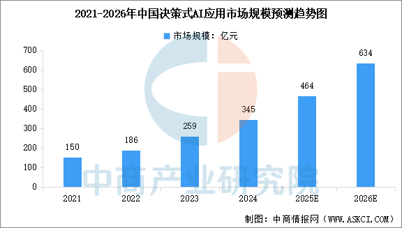 中商产业研究院发布的《2025-2030年人工智能技术应用行业市场调研及投资前景预测报告》显示,中国决策式AI应用市场规模由2021年的150亿元增至2024年的345亿元,复合年增长率为32%。在企业数字化转型需求、数据量指数增长及科技进步的驱动下,中国决策AI应用市场规模有望进一步扩大。中商产业研究院分析师预测,2025年中国决策式AI应用市场规模将达到464亿元,2026年市场规模将达到634亿元。