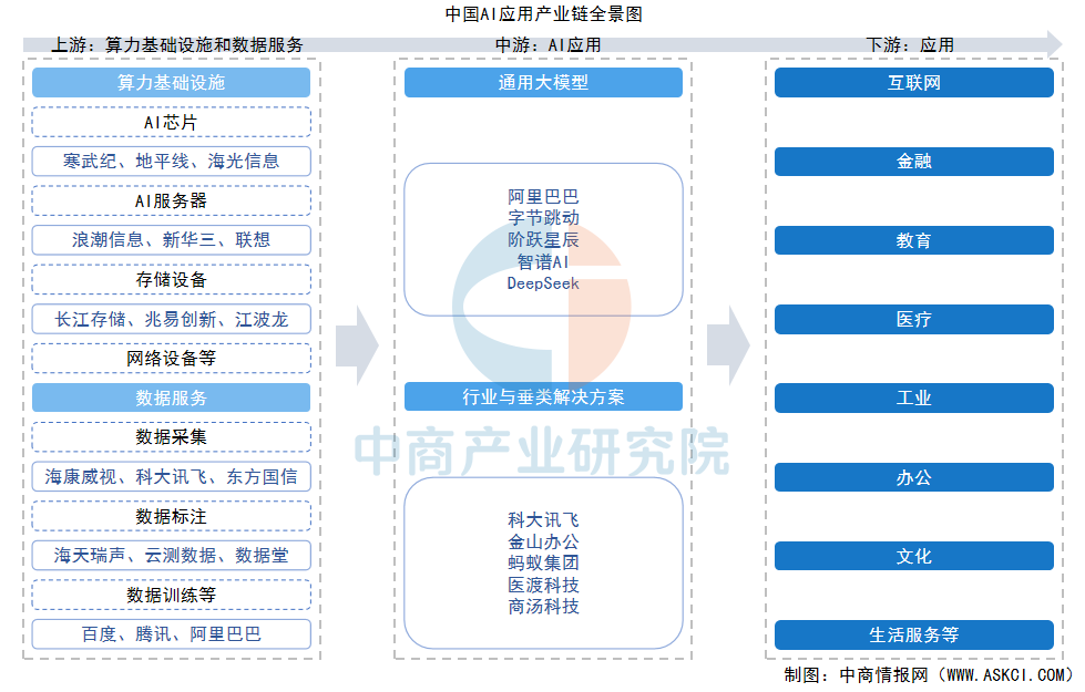 AI应用产业链分为上游、中游和下游三个环节。上游提供算力基础设施和数据服务,包括AI芯片、AI服务器、存储设备、网络及基础数据服务。中游为AI应用提供商,根据不同领域开发解决方案,满足多样化的应用需求。下游面向互联网、金融、教育、医疗、工业等领域。