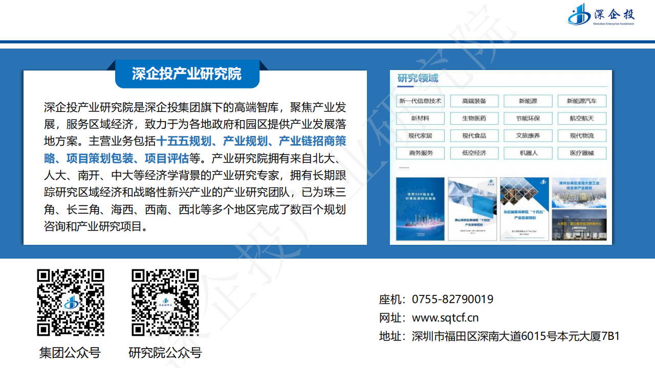 深企投产业研究院是深企投集团旗下的高端智库,聚焦产业发展,服务区域经济,致力于为各地政府和园区提供产业发展落地方案。主营业务包括十五五规划、产业规划、产业链招商策略、项目策划包装、项目评估等。产业研究院拥有来自北大、人大、南开、中大等经济学背景的产业研究专家,拥有长期跟踪研究区域经济和战略性新兴产业的产业研究团队,已为珠三角、长三角、海西、西南、西北等多个地区完成了数百个规划咨询和产业研究项目。